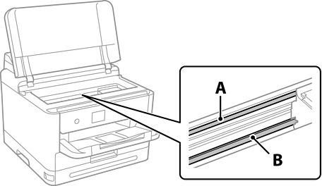 Vær forsiktig så du ikke berører skinnen (B). Ellers kan du muligens ikke skrive ut. Ikke tørk av fettet på skinnen, da det er nødvendig for operasjoner.