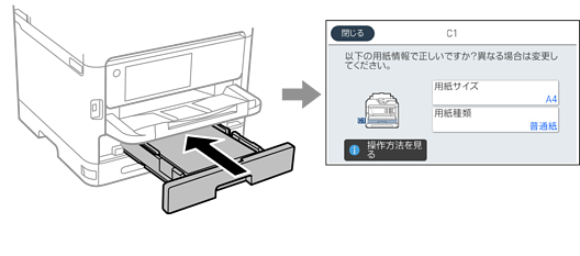 用紙カセット挿入時にプリンターに表示される画面で、必ず用紙サイズと種類を登録してください。登録情報と印刷設定が異なるときにプリンターがお知らせします。サイズを間違って印刷してしまったり、用紙種類に合った印刷ができず色味が変わってしまったりすることを防ぎ、用紙やインクを無駄にせずに済みます。