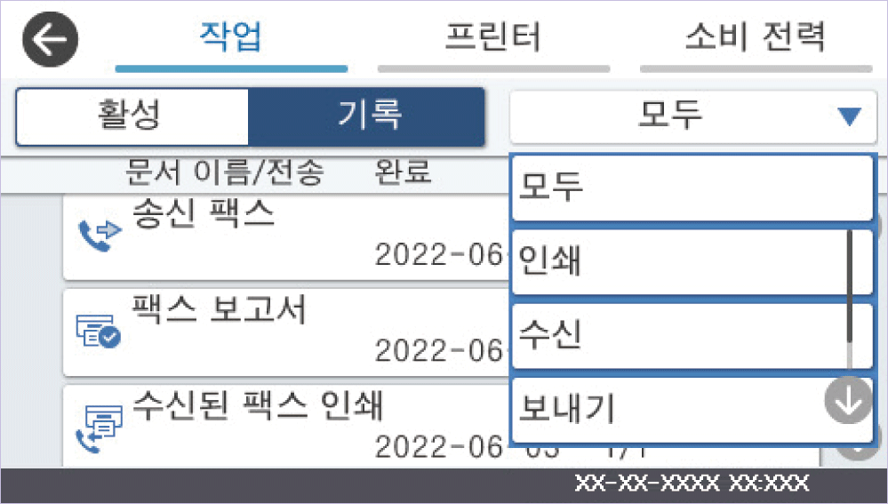 진행 중인 팩스 작업을 확인하거나 작업 기록을 확인할 수 있습니다.