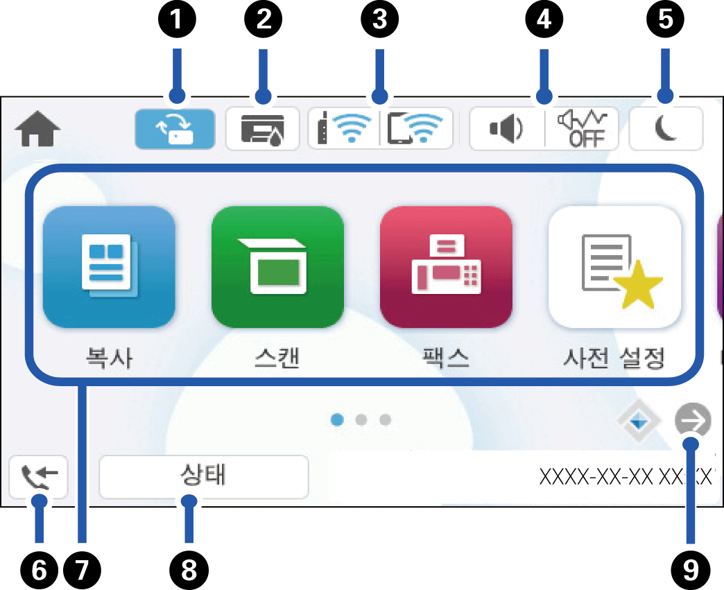 프린터 상태 화면을 표시합니다. 잉크 잔량 및 유지보수 상자의 서비스 수명을 대략적으로 확인할 수 있습니다. |