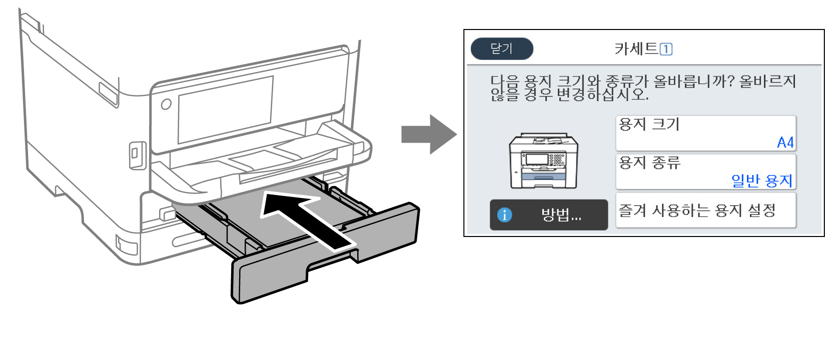 용지를 급지할 때 표시되는 화면에서 용지 크기와 종류를 등록했는지 확인하십시오. 등록된 정보와 인쇄 설정이 다를 경우 프린터에서 알려줍니다. 이렇게 하면 용지 종류와 일치하지 않는 설정을 사용하여 잘못된 용지 크기로 인쇄하거나, 잘못된 색상으로 인쇄하지 않도록 하여 용지와 잉크를 낭비하는 것을 방지할 수 있습니다.