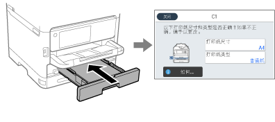 确保在装入打印纸时,您已在显示的屏幕上注册了打印纸尺寸和类型。当注册信息和打印设置不同时,本产品将发出通知。这样可避免由于设置与打印纸类型不匹配而使用不正确的打印纸尺寸或按错误的颜色进行打印,从而防止浪费打印纸和墨水。