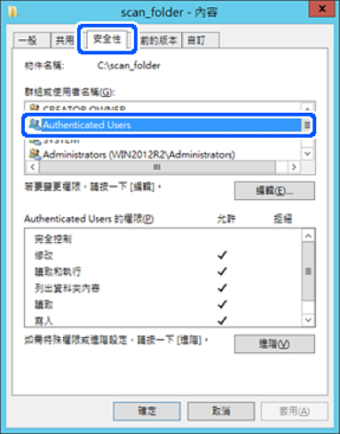 若未選取,請選取[已驗證的使用者],按下[編輯],在[已驗證的使用者權限]中選取[修改]上的[允許],然後再按下 [OK]。