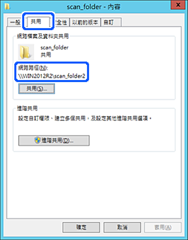 會顯示共用資料夾的網路路徑。在登錄至印表機的聯絡人時會使用此資訊。請將此資訊寫下來。