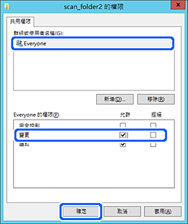 選取[群組或使用者名稱]的[所有人]群組,選取[變更]上的[允許],然後按下 [OK]。