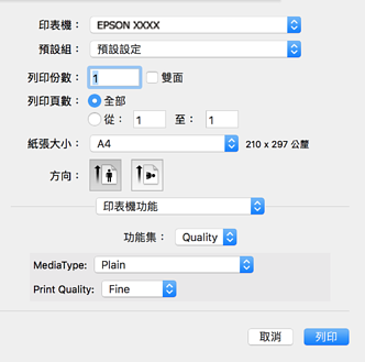 > 列印 > 列印文件 > 從 PostScript 印表機驅動程式列印 (Mac OS)