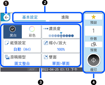 使用索引標籤切換設定清單。[基本設定] 索引標籤顯示頻繁使用的項目。[進階] 索引標籤顯示您可視需要設定的其他項目。 |