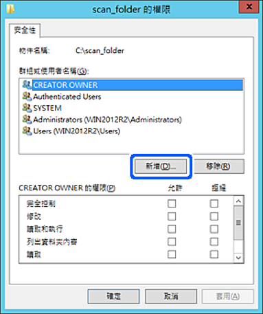 在權限畫面內,選擇已輸入[群組或使用者名稱]的使用者名稱,在[變更]上選擇存取權限,然後按一下 [OK]。