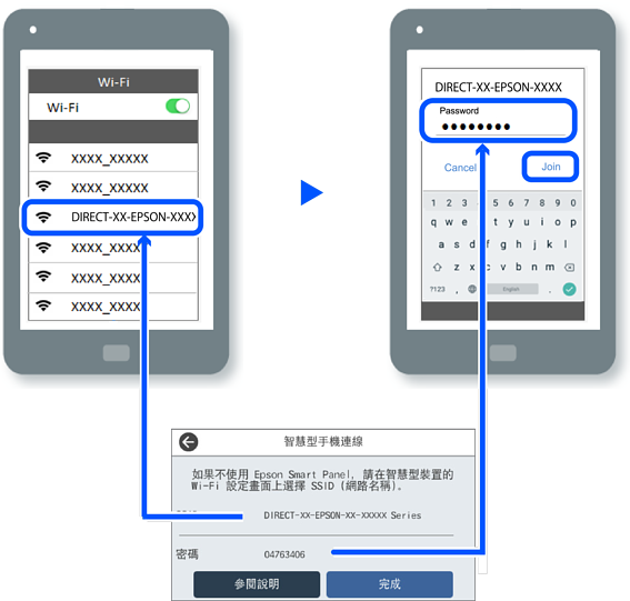 在裝置的 Wi-Fi 畫面上,選取印表機控制面板上顯示的 SSID,然後輸入密碼。