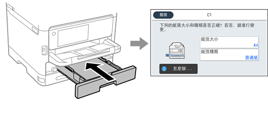 務必在放入紙張後顯示的畫面上登錄紙張大小和種類。當登錄的資訊與列印設定不同時,印表機會通知您。這可確保您不會由於使用不符合紙張類型的設定列印於錯誤紙張大小上或列印錯誤色彩,從而防止紙張和墨水浪費。