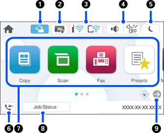 Displays on-going jobs that are standing by. Tap to display the type of jobs, arrival timer, user names, and so on as a list. The number displayed indicates the number of jobs that are standing by. |