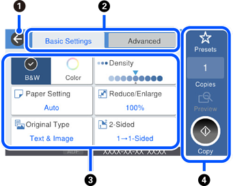 Zum Umschalten der Einstellungsliste mithilfe der Registerkarten. Auf der Registerkarte Grundeinstellungen werden häufig verwendete Elemente angezeigt. Die Registerkarte Erweitert zeigt weitere Elemente, die falls erforderlich eingestellt werden können.
