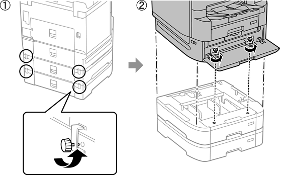 השלם את השלבים הכרוכים בהזזת המדפסת ואז הסר את מחסניות הנייר 2, 3 ו- 4. לאחר מכן, בצע את השלבים המתוארים בתמונות הבאות.
