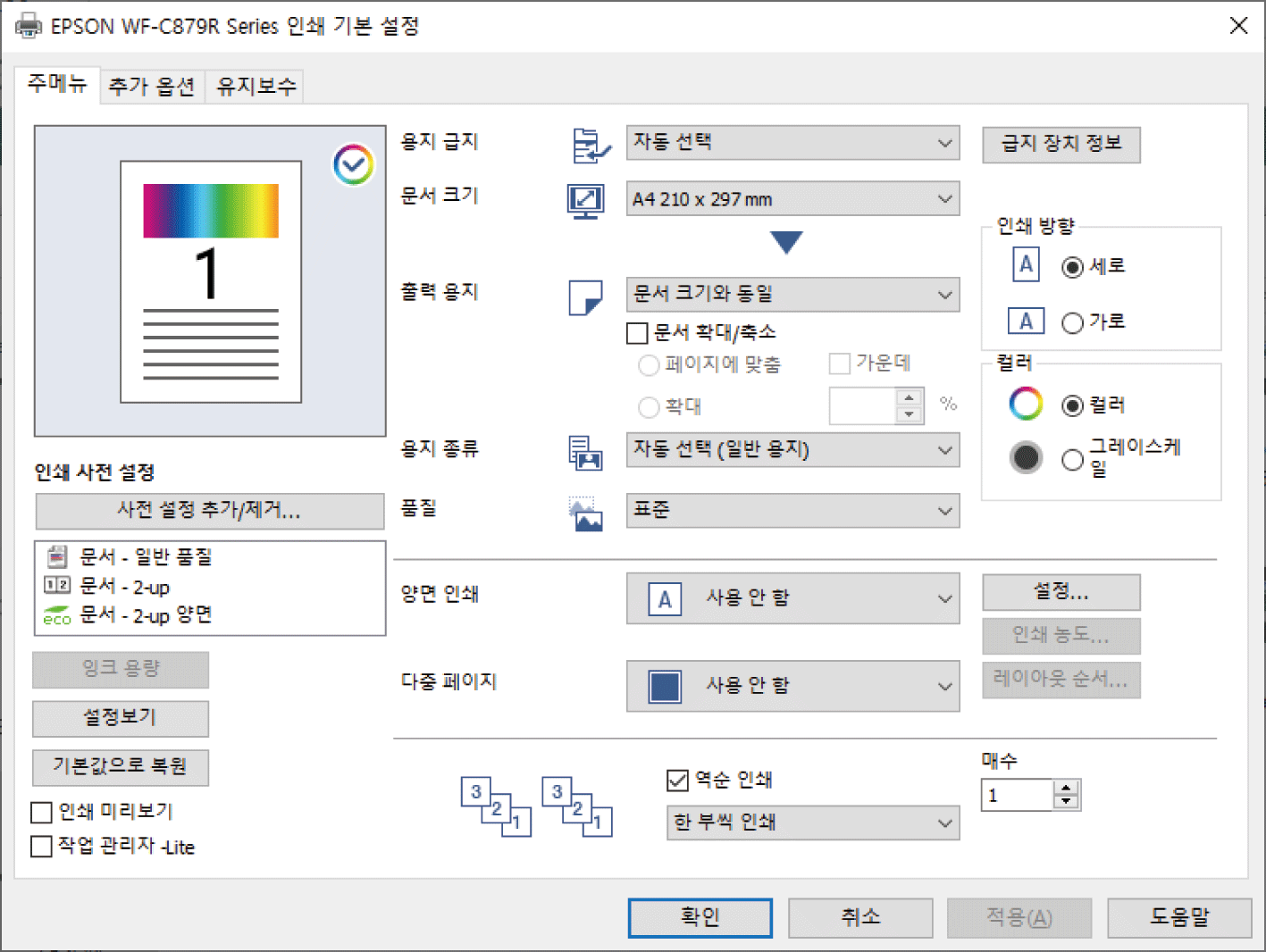 프린터 드라이버 창을 열려면 기본 설정 또는 속성을 선택합니다.