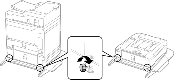 Déposez délicatement l’imprimante ou un bac à papier sur le socle de l’imprimante en alignant les coins, puis fixez l’ensemble à l’aide des vis.