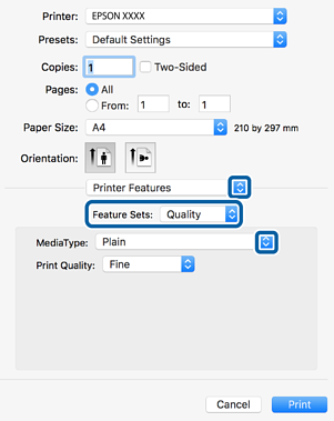 Sélectionnez Fonctionnalités imprimante à partir du menu contextuel, sélectionnez Qualité en tant que Ensembles de fonctionnalités, puis sélectionnez le type de papier chargé en tant que paramètre Type de papier.