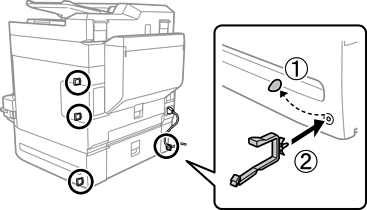 प्रिंटर या पेपर कैसेट इकाई को अनुलग्नक और स्क्रू के साथ पीछे की तरफ़ कसें।