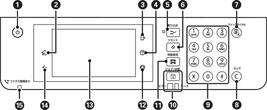 項目やメッセージを表示します。 操作パネルの角度は変更できます。一定の時間以上操作しないとスリープモードになり、表示が消えます。タッチパネルをタップすると復帰します。設定によっては、操作パネルのボタンを押すことにより、スリープモードから元の明るさに復帰します。 |