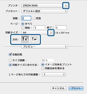 ポップアップメニューで[プリンタの機能]を選択し、[機能セット]で[印刷品質]を選択して、[用紙種類]でセットした印刷用紙の種類を選択します。