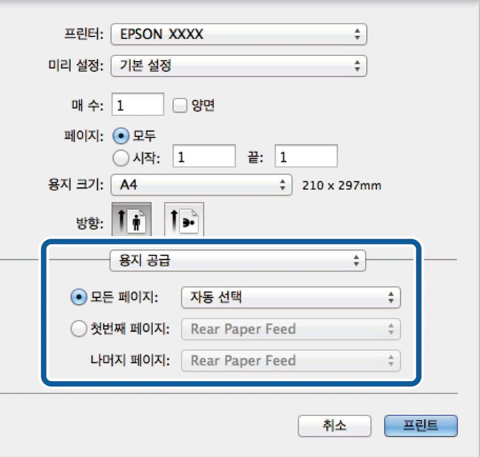 팝업 메뉴에서 용지 공급을 선택한 후 용지를 급지할 용지 공급 장치를 선택합니다.