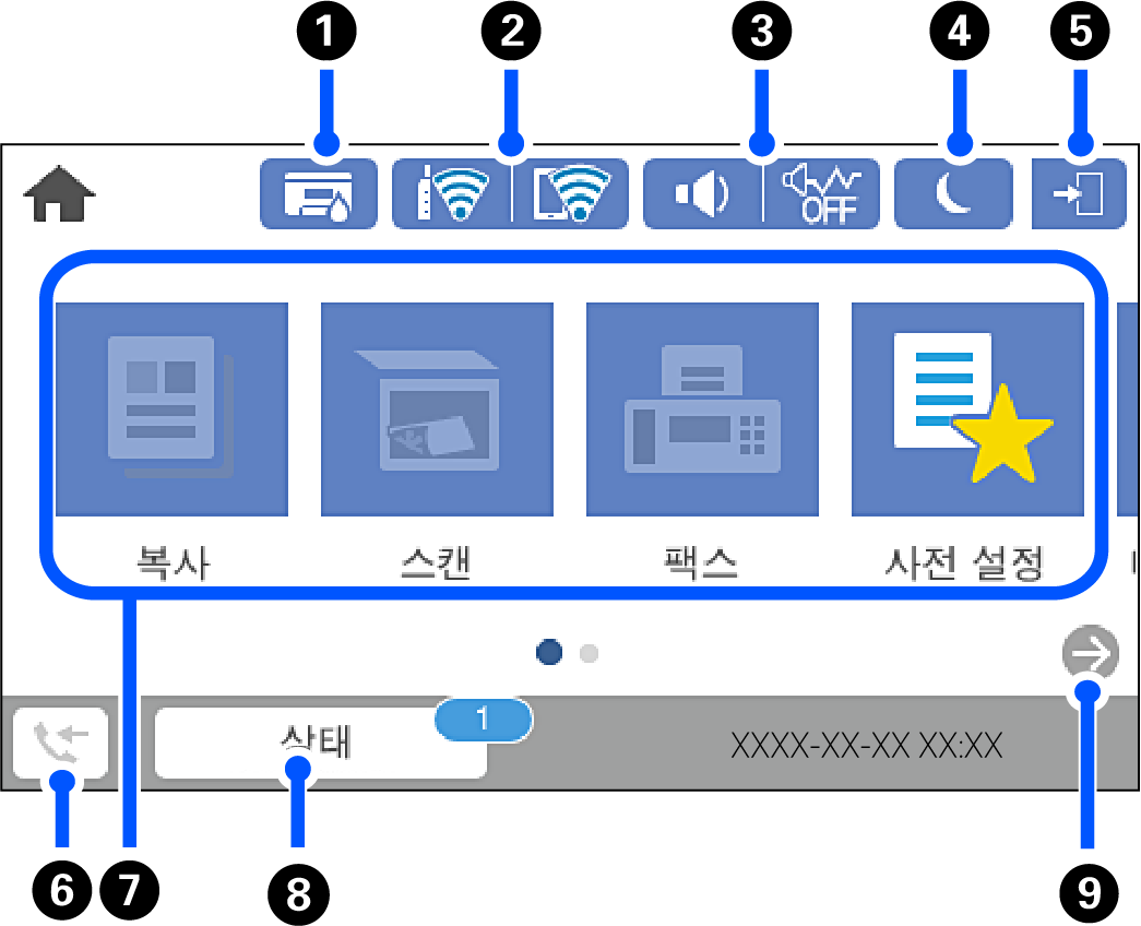 프린터 상태 화면을 표시합니다. 잉크 잔량 및 유지보수 상자의 서비스 수명을 대략적으로 확인할 수 있습니다. |
