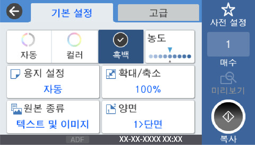 기본 설정 탭을 선택한 후 자동 또는 컬러, 흑백을 선택합니다.