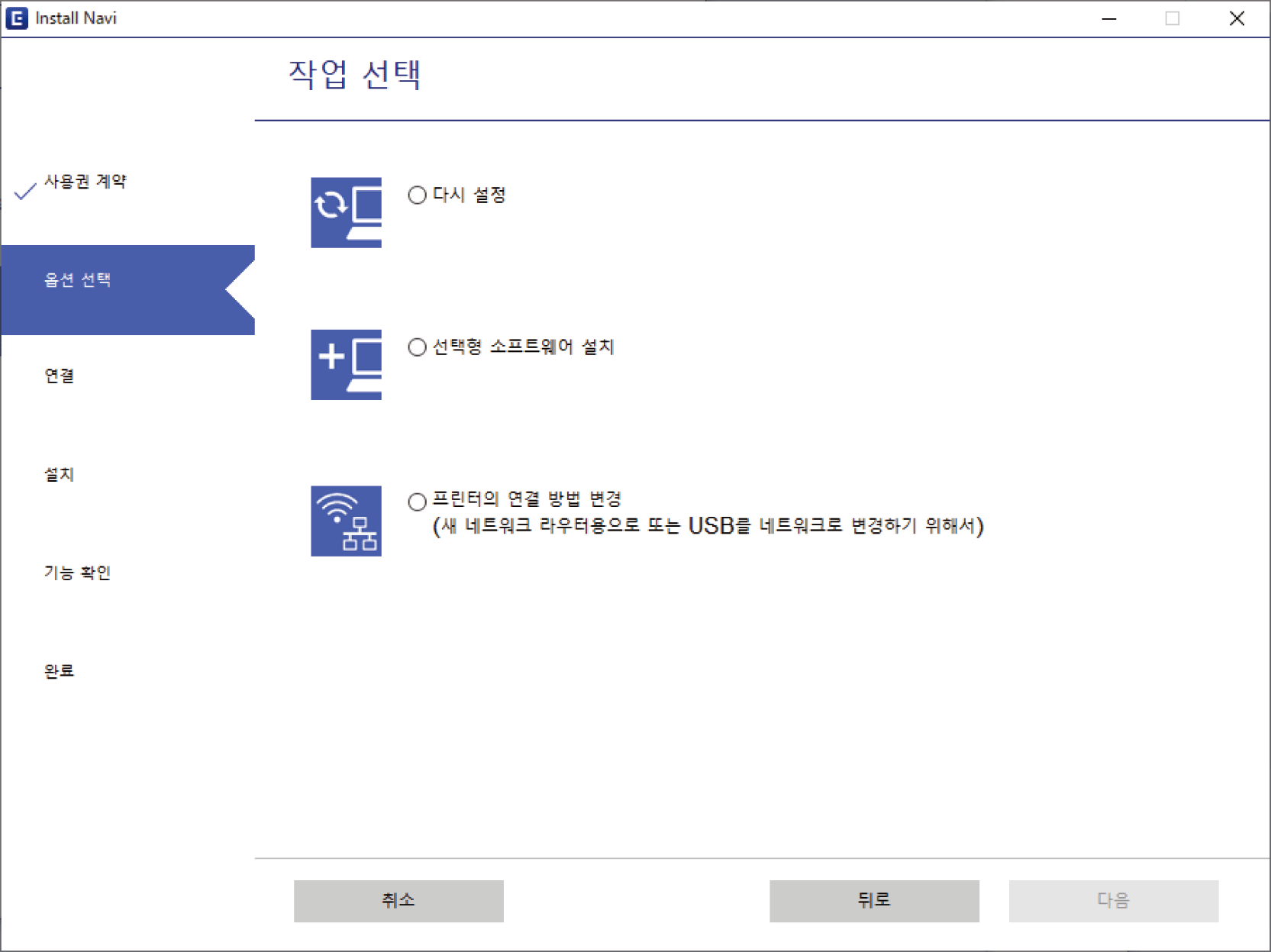 작업 선택 화면에서 프린터의 연결 방법 변경 (새 네트워크 라우터용으로 또는 USB를 네트워크로 변경하기 위해서)을 선택한 후 다음을 클릭합니다.