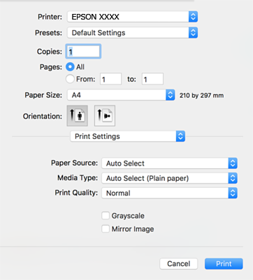 Se o menu Definições de Impressão não for exibido em macOS High Sierra, macOS Sierra, OS X El Capitan, OS X Yosemite, OS X Mavericks, OS X Mountain Lion, o controlador de impressora Epson não foi instalado corretamente. Ativar no seguinte menu. macOS Catalina e macOS Mojave não conseguem aceder às Definições de Impressão nas aplicações desenvolvidas pela Apple como por exemplo TextEdit.