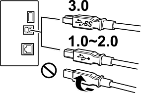 使用 USB 1.0 到 2.0 的纜線時,請注意插入方向,否則印表機可能會損壞。