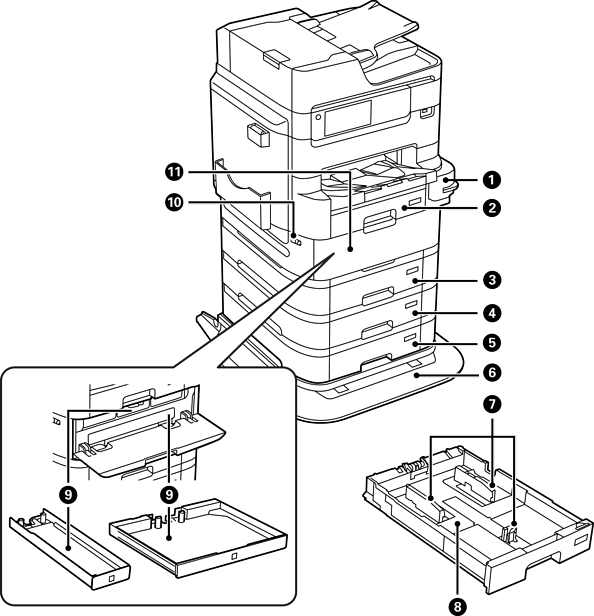 放入紙張。選購的進紙匣單元。在安裝此選項後使用。請參考相關資訊以了解更多詳細說明。 |