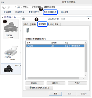 點選[驅動程式]索引標籤。如果清單中顯示了您的印表機名稱,表明您的電腦已安裝原廠 Epson 印表機驅動程式。