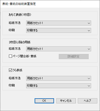 5. 表示された画面で[おもて表紙(1枚目)]、[2枚目以降の用紙]、[うら表紙]を設定します。