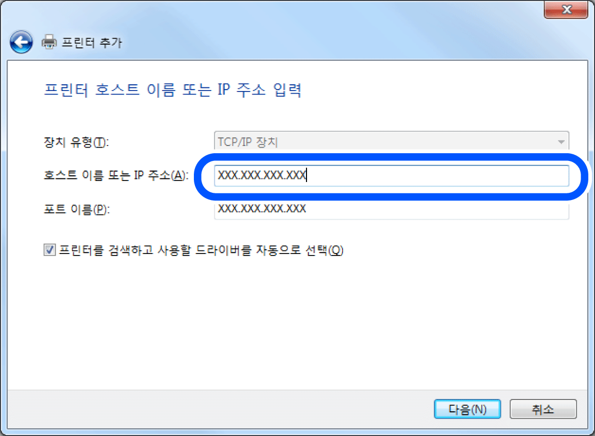 5. 호스트 이름 또는 IP 주소 또는 프린터 이름 또는 IP 주소에 프린터의 IP 주소 또는 프린터 이름을 입력한 후 다음을 클릭합니다.