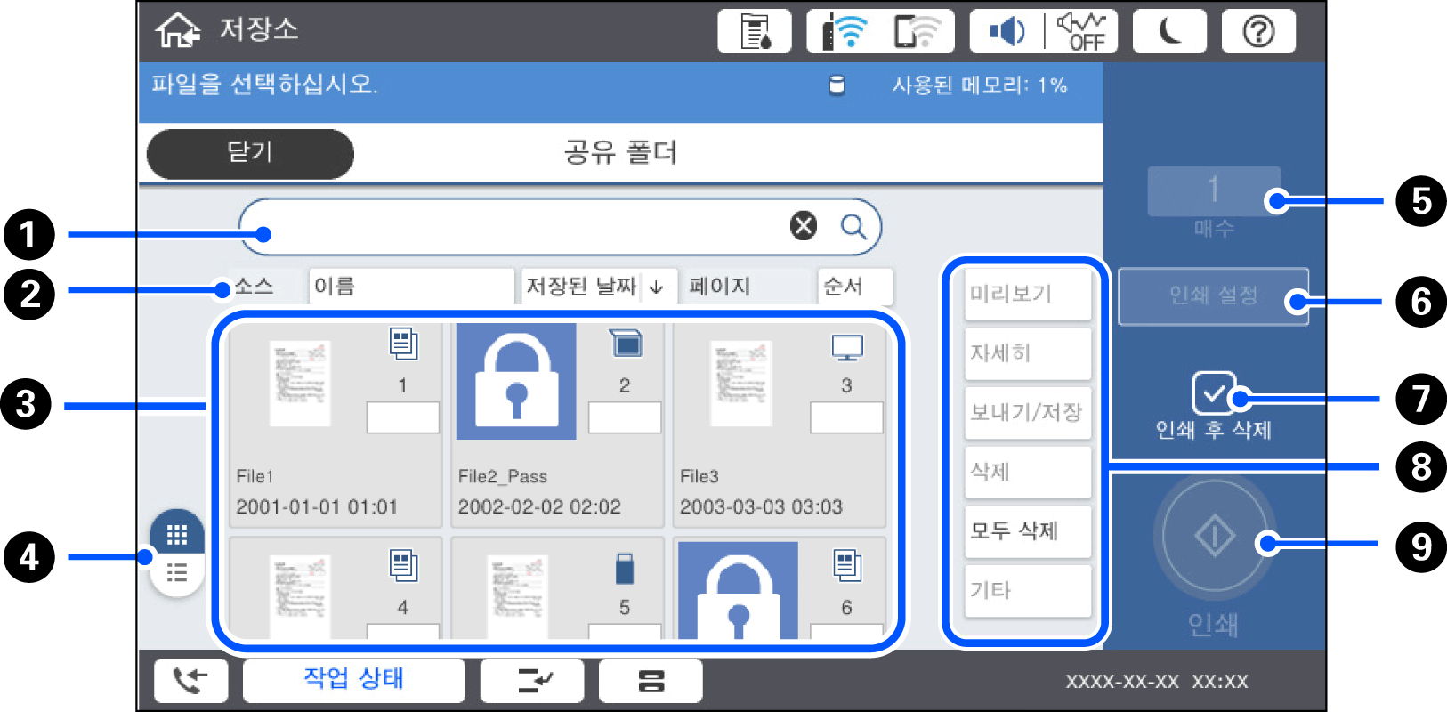 미리보기, 출력, 파일 삭제 등 실행하려는 작업을 선택합니다. 또는 여기서 파일 이름, 사용자 및 비밀번호를 변경할 수 있습니다. |