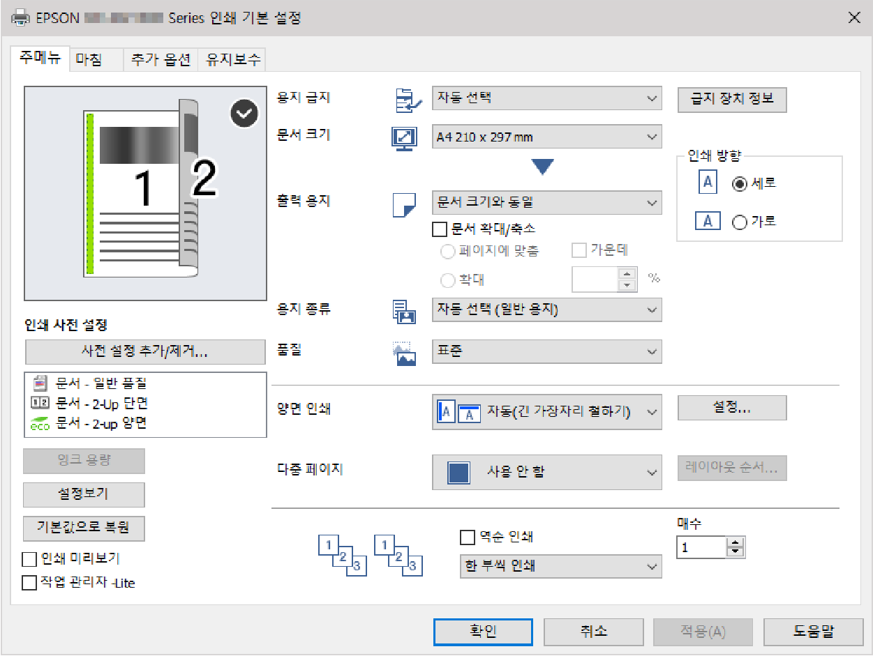 용지의 한 면에만 인쇄하려면 양면 인쇄를 사용 안 함으로 설정하십시오.