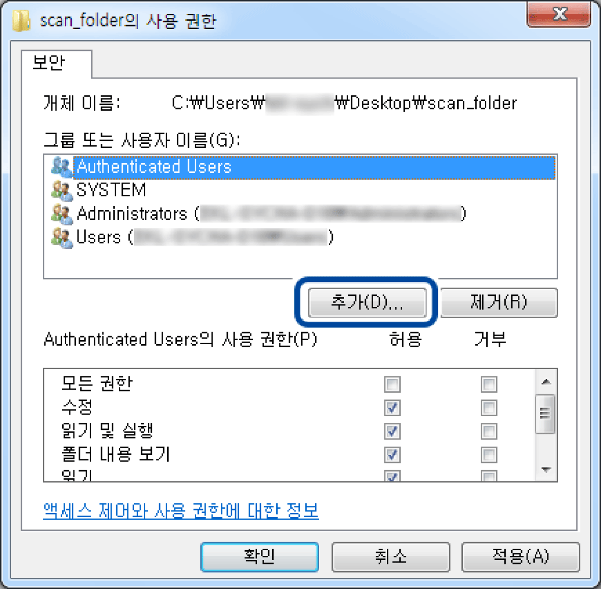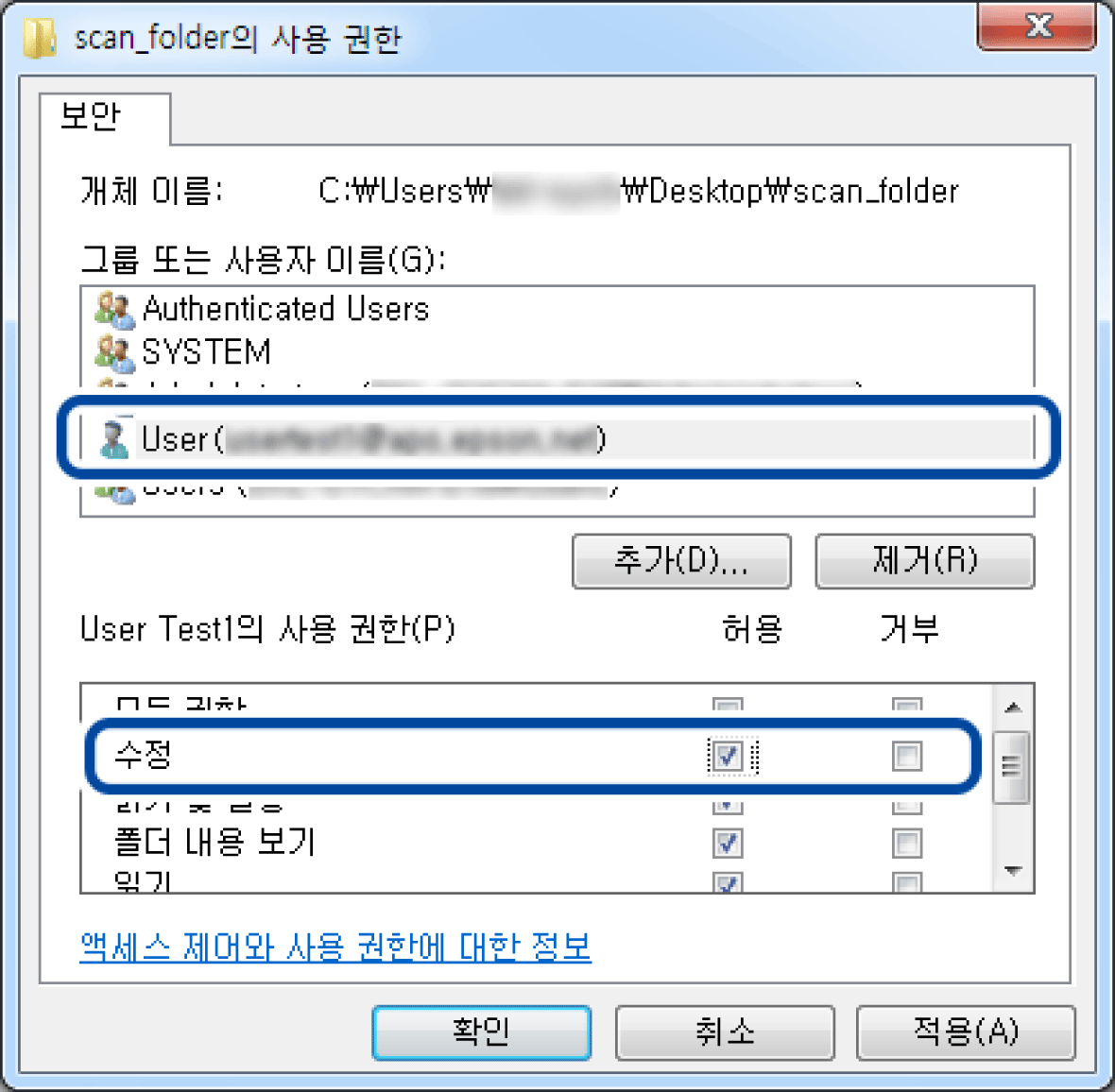 사용 권한 화면에서 그룹 또는 사용자 이름에 입력한 사용자 이름을 선택하고 수정에서 허용을 선택한 후 확인을 클릭합니다.