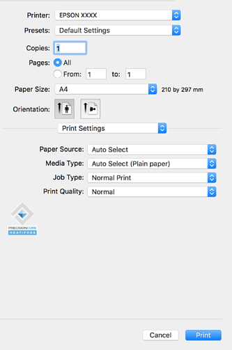Agar Chop etish sozlamalari menyusi macOS Catalina (10.15) yoki keyingi versiyasi, macOS High Sierra (10.13), macOS Sierra (10.12), OS X El Capitan (10.11), OS X Yosemite (10.10), OS X Mavericks (10.9), OS X Mountain Lion (10.8)-da namoyish qilinmasa, Epson printer drayverining to‘g‘ri o‘rnatilmagan. Uni quyidagi menyudan yoqing.