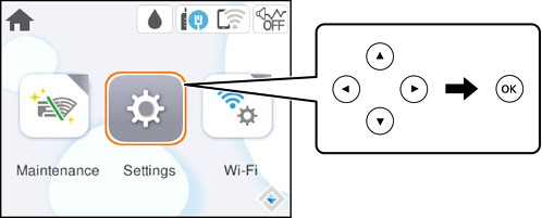 ボタンでフォーカスを動かし項目を選択します。OKボタンで項目の確定や機能を実行します。