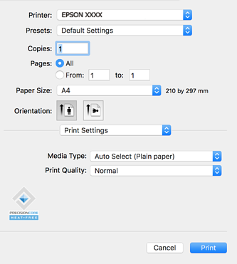 إذا لم تظهر قائمة إعدادات الطباعة في macOS Catalina (10.15) أو الأحدث وmacOS High Sierra (10.13) وmacOS Sierra (10.12) وOS X El Capitan (10.11) وOS X Yosemite (10.10) وOS X Mavericks (10.9)، فذلك يعني عدم تثبيت برنامج تشغيل طابعة Epson بشكل صحيح. وقم بتمكينه من القائمة التالية.