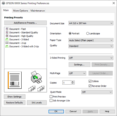 Izaberite Željene opcije ili Svojstva da biste pristupili prozoru upravljačkog programa štampača.