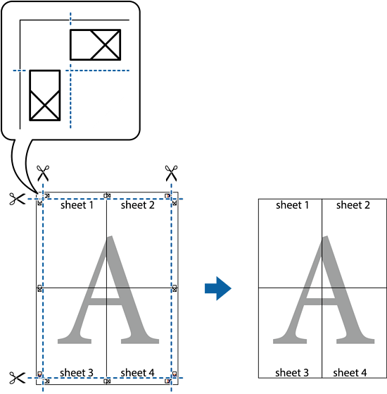 Isecite margine Sheet 1 i Sheet 2 duž horizontalne plave linije kroz centar krstića sa leve i desne strane.
