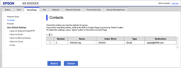 Truy cập Web Config và chọn tab Scan/Copy hoặc Fax > Contacts.