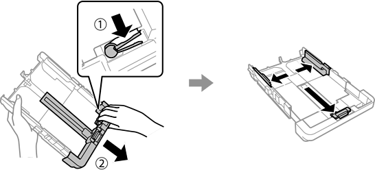Kéo hộc đựng giấy ra, và sau đó trượt các thanh dẫn hướng cạnh đến vị trí tối đa của chúng.