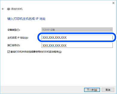 在主机名或 IP 地址或打印机名称或 IP 地址中输入本产品的 IP 地址或产品名称,然后单击下一步。