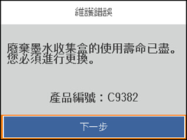 當顯示提示您更換廢棄墨水收集盒的訊息時,請參閱控制面板上顯示的動畫。根據印表機的規格,需要更換廢棄墨水收集盒不代表印表機停止運作。Epson 保固未涵蓋此項更換的成本。此為使用者可自行維修的零件。
