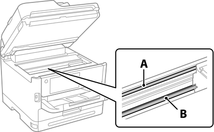Aveți grijă să nu atingeți șina (B). În caz contrar, este posibil să nu puteți tipări. Nu ștergeți unsoarea de pe șină, deoarece aceasta este necesară pentru funcționare.