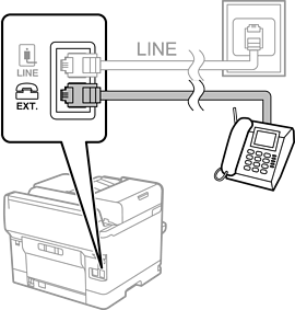 Če si napravi delita eno telefonsko linijo, morate telefonsko napravo priključiti v vrata EXT. na tiskalniku. Če linijo razdelite in ločeno priključite telefonsko napravo in tiskalnik, telefon in tiskalnik ne delujeta pravilno.