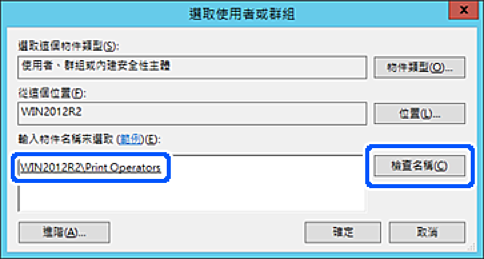 如果您不知道群組或使用者的完整名稱,請輸入其名稱的一部分,然後按一下[檢查名稱]。匹配此名稱一部分的群組名稱或使用者名稱隨即列示,然後您可以從清單中選取完整名稱。