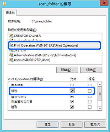 在權限畫面內,選擇已輸入[群組或使用者名稱]的使用者名稱,在[變更]上選擇存取權限,然後按一下 [OK]。