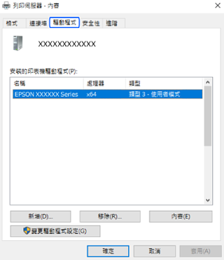 按下[驅動程式]索引標籤。如果清單中顯示了您的印表機名稱,表明您的電腦已安裝原廠 Epson 印表機驅動程式。